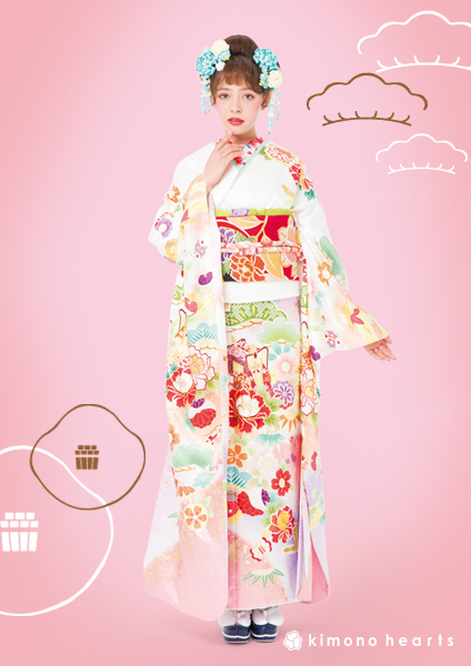 淡いピンクに可憐な花柄。真っ赤な帯で愛らしくまとめて。