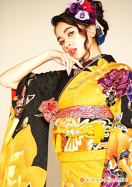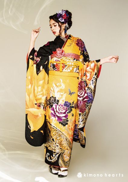 目を引く黄色と黒の強めカラーに、薔薇の周りを舞い踊る蝶が華やかで美しい。