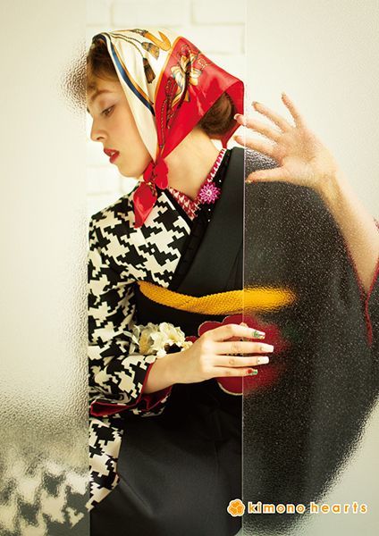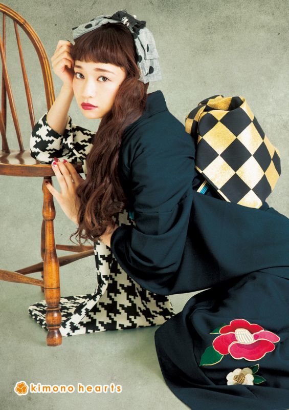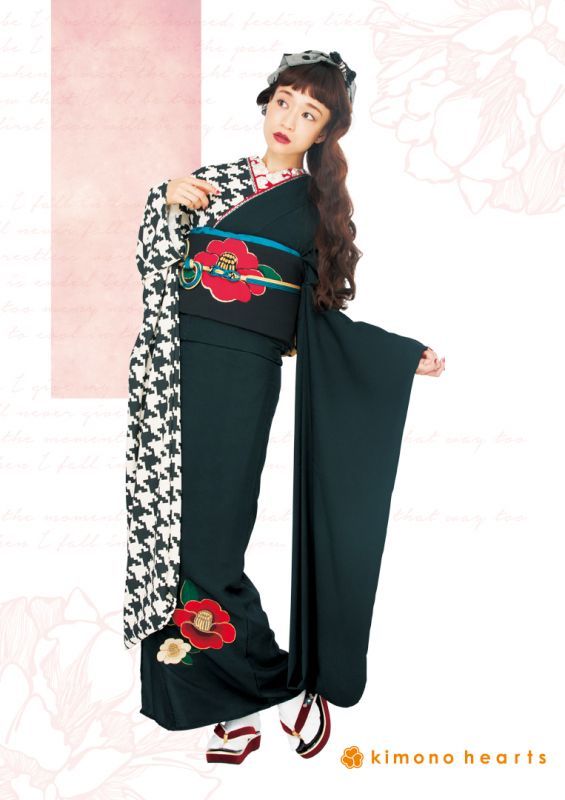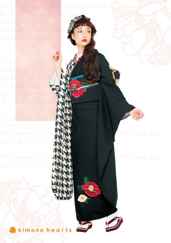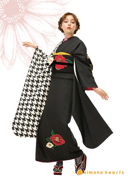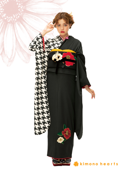 半分は無地に大きな椿刺繍、半分は千鳥柄の大胆なキモノハーツオリジナルお振袖です。黒色なので大人っぽさも入れつつ、モダンながらもノスタルジックな雰囲気に仕上げてくれます。