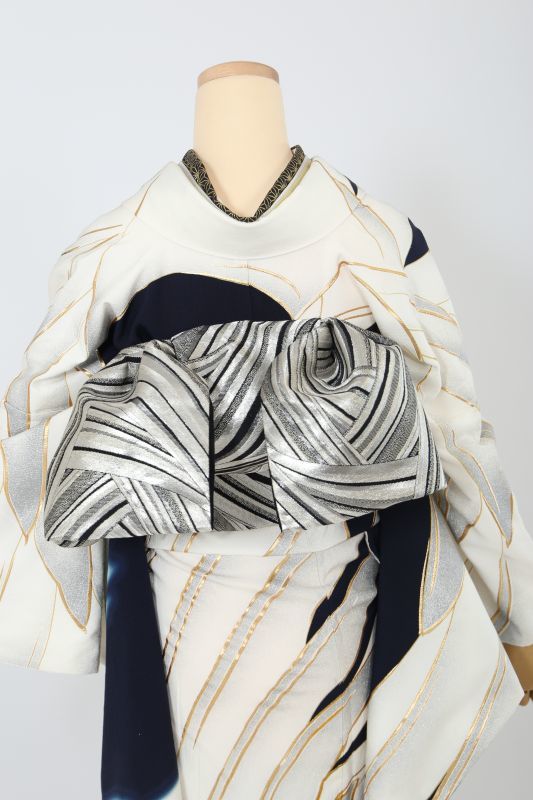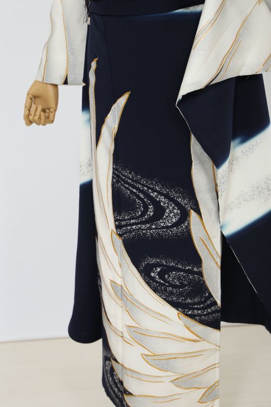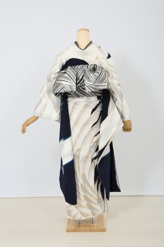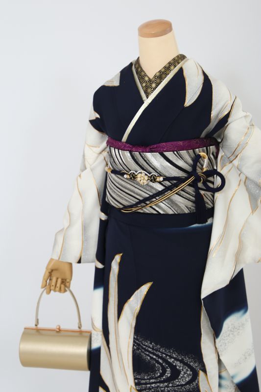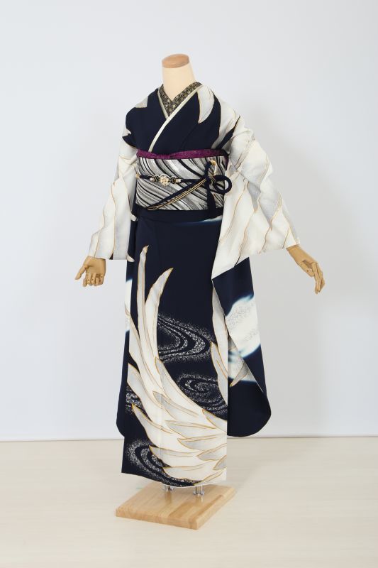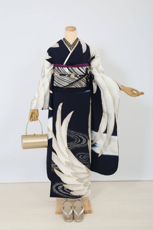 黒地に大きな鶴の羽がインパクト十分なお振袖。シックにまとめて、とことんモードな雰囲気に。