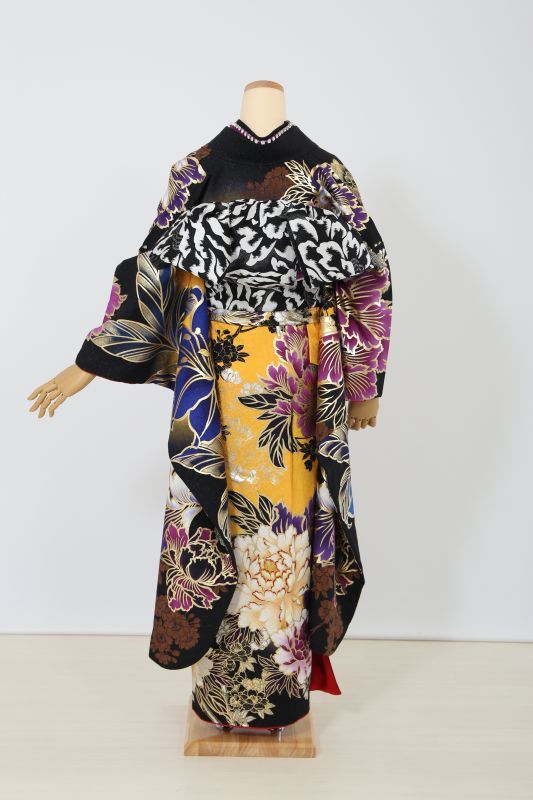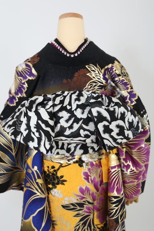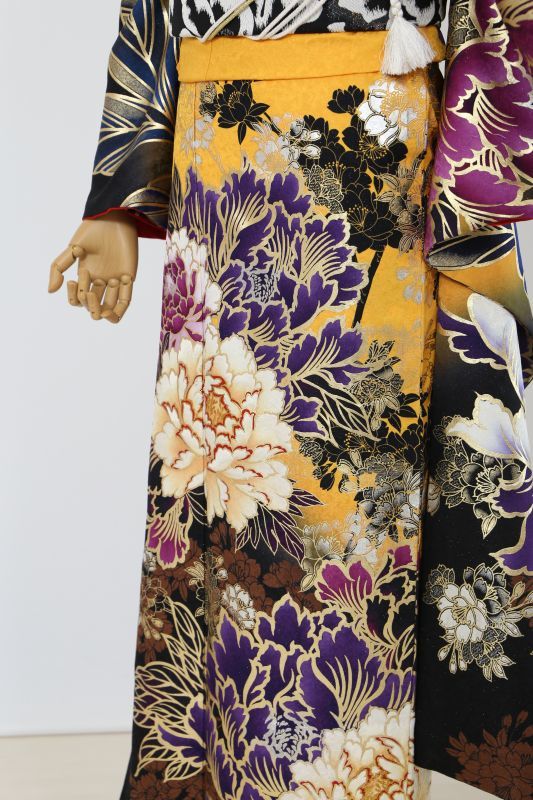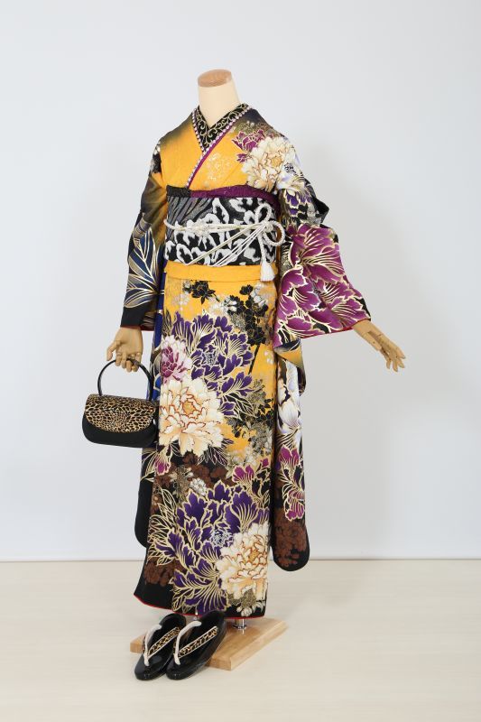黒と黄色のコントラストがカッコイイSweetAngelのブランド振袖。金彩で囲まれた大きな牡丹がインパクト抜群。金箔もたくさんあってゴージャスな一枚。