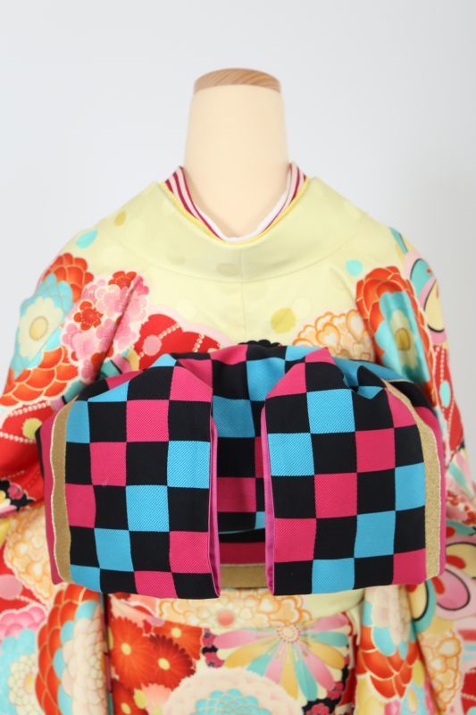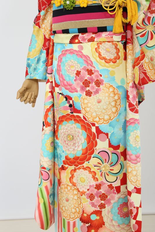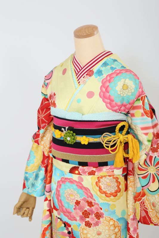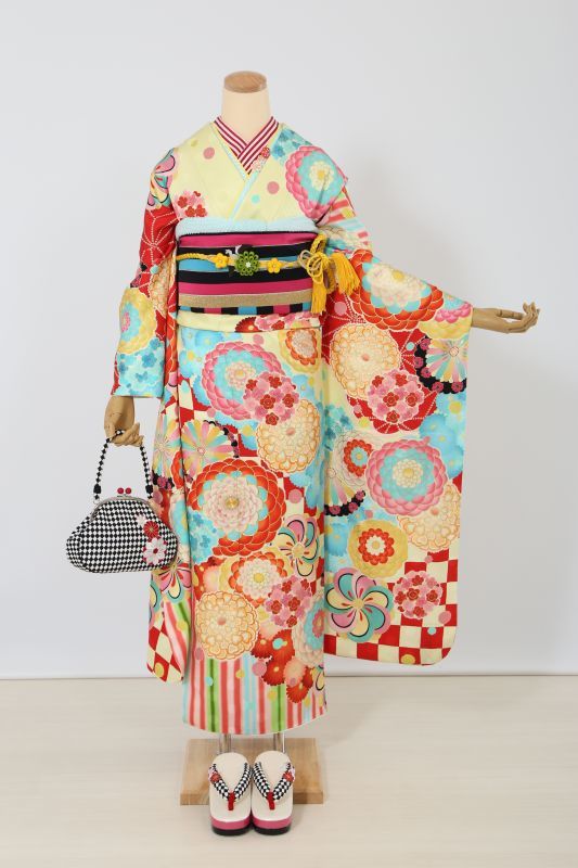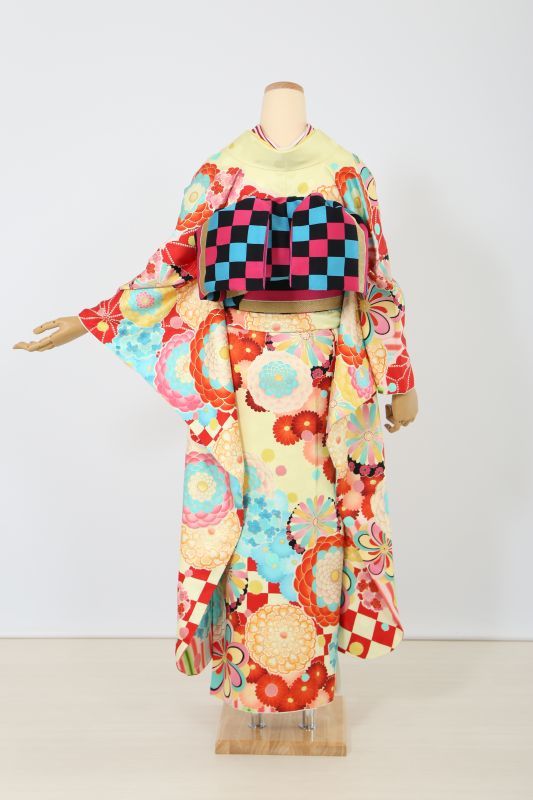 blytheのブランド振袖。大きな万寿菊柄に裾には市松とストライプでレトロポップで可愛い。カスタード色に水色や赤など沢山のカラフルな色が入ってお菓子のよう。お人形さんになりたいかたにおススメ。