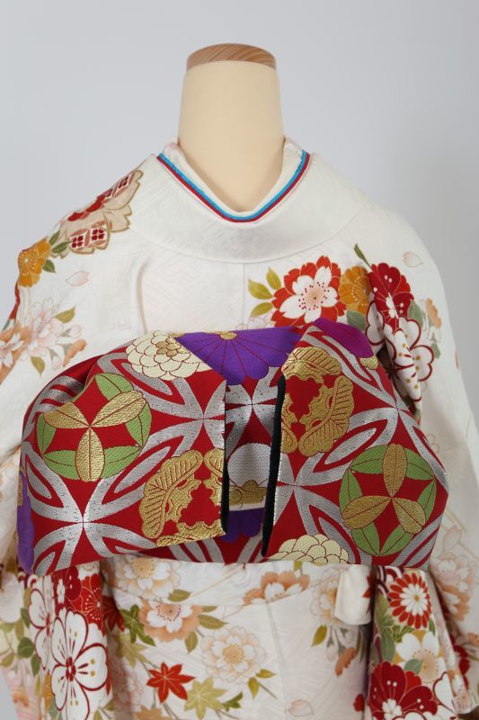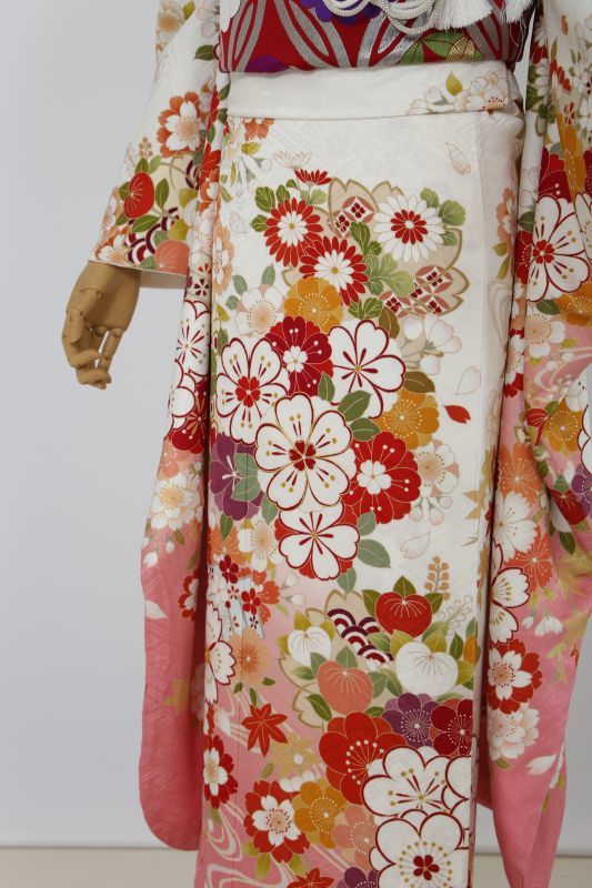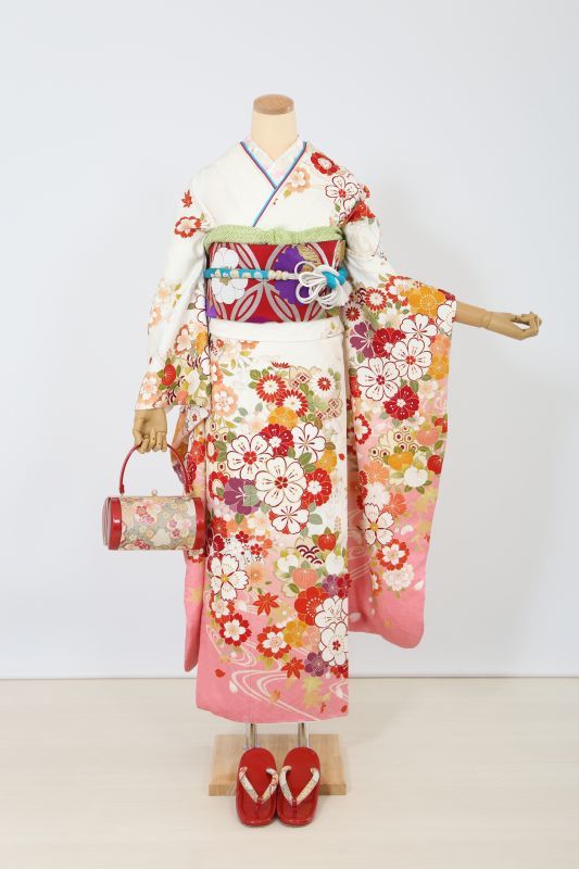 白地に裾がピンクの可愛らしいお振袖。小さいお花が舞っており、女の子らしく、かつ上品さも出てきます。