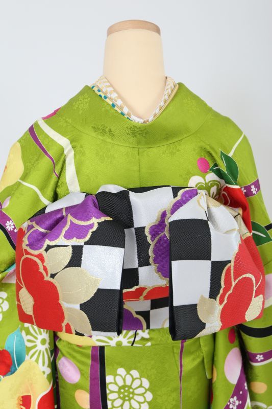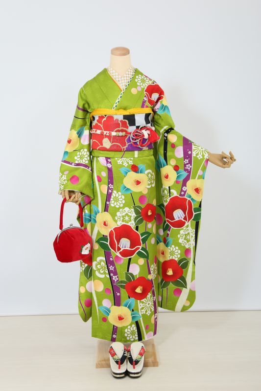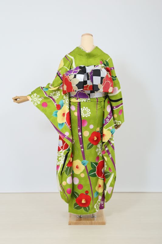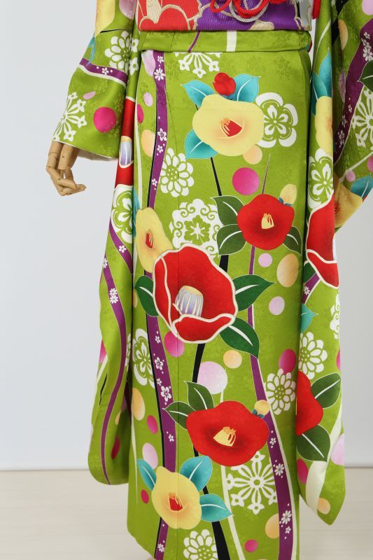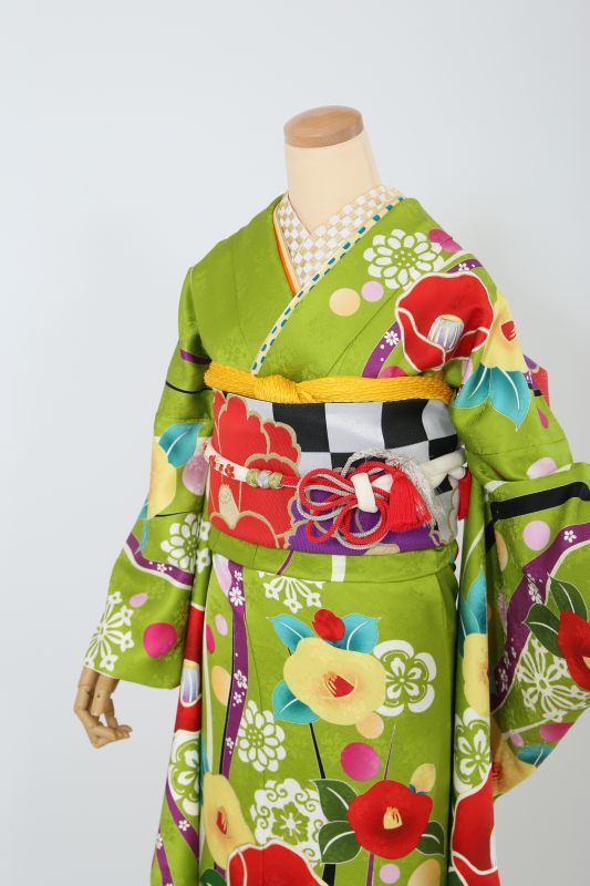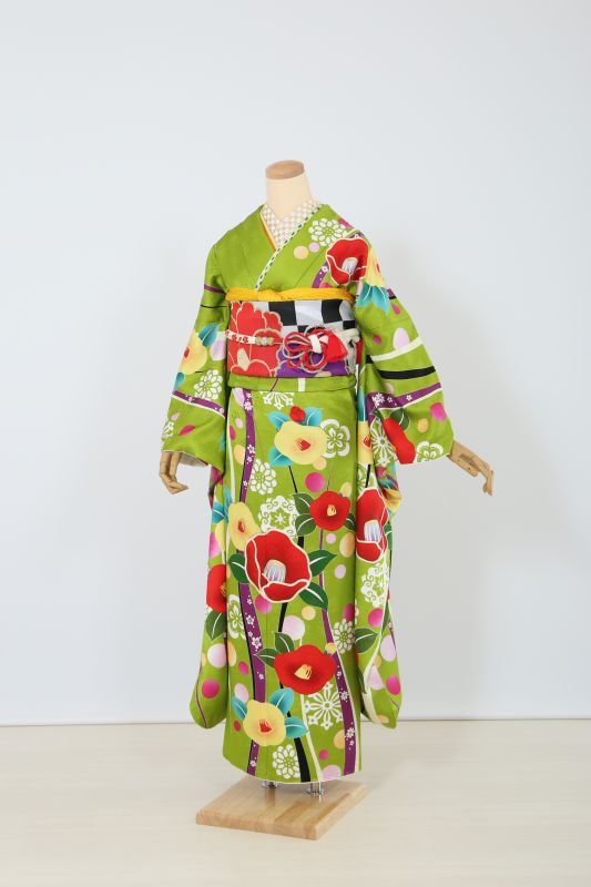 珍しい黄緑色にカラフルポップな椿柄が可愛いレトロお振袖。コロっとした柄が可愛さを演出してくれます。