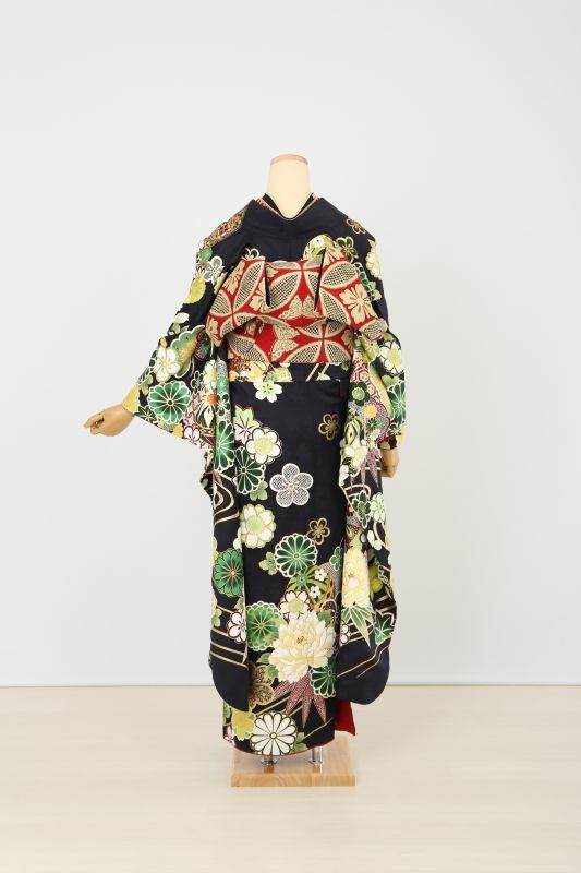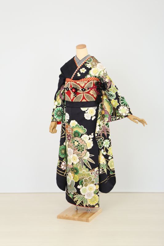 黒地に、緑色の伝統古典柄が入ったお振袖。普通は色んな色が入っているのに対して、緑系統で統一されているのが珍しいです。帯も金ではなく色帯でお洒落に。