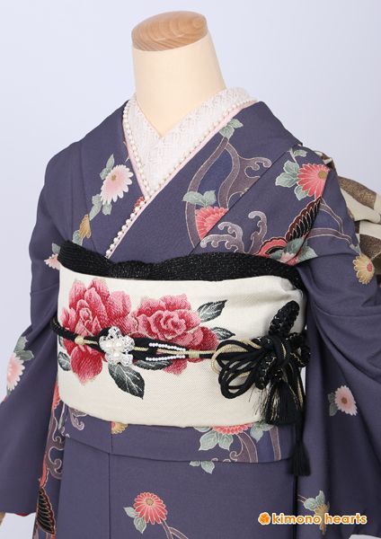 珍しいグレーのお振袖。くすみ色で描かれた蝶々やお花が儚げなノスタルジックの雰囲気を醸し出します。上品と可愛さを兼ね備えた一枚。