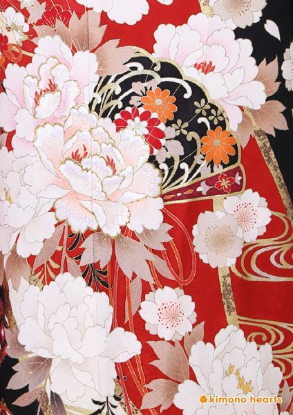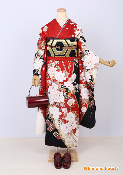 深い赤に大きな牡丹・流水柄がカッコイイ振袖。大きく黒地色もはいっており、粋な雰囲気になります。