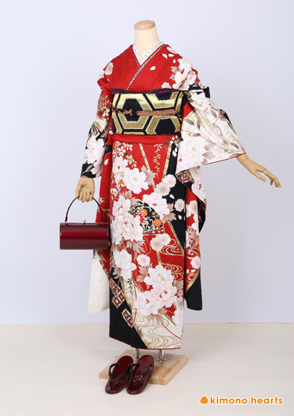 成人式フルセットレンタル 粋古典 赤黒 牡丹 流水