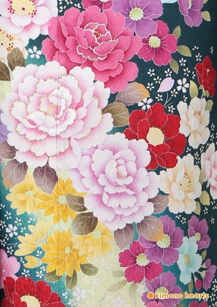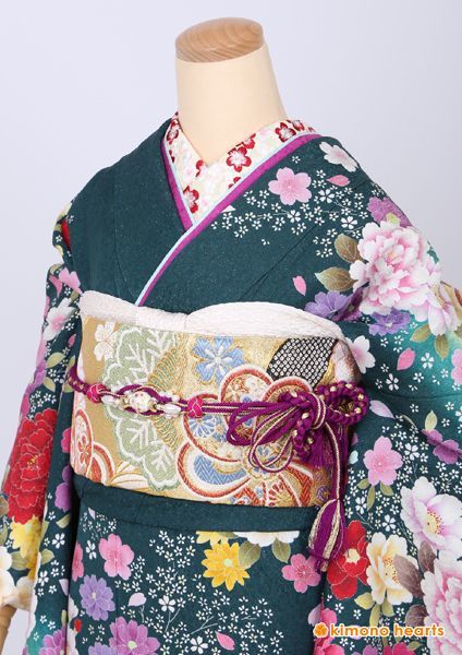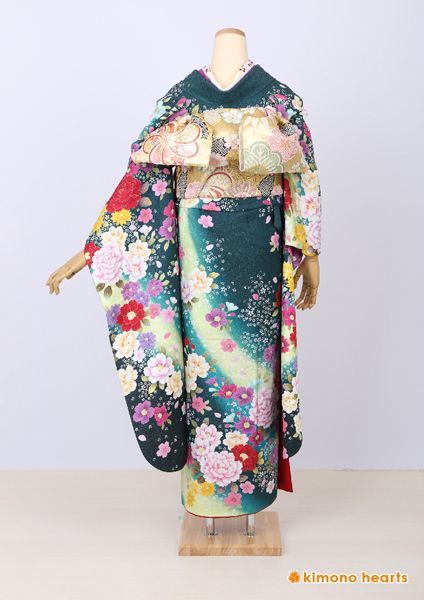 人気カラー。上品な深いグリーンの振袖。鮮やかな花々で彩られたデザインンは派手すぎず知的なイメージ。