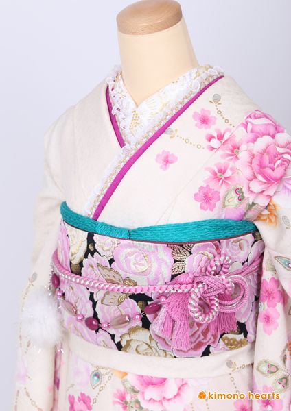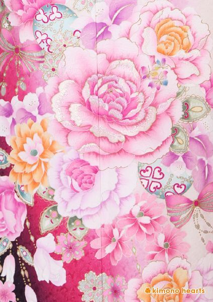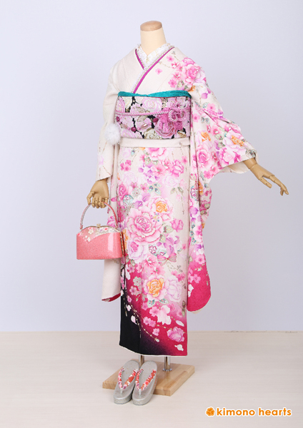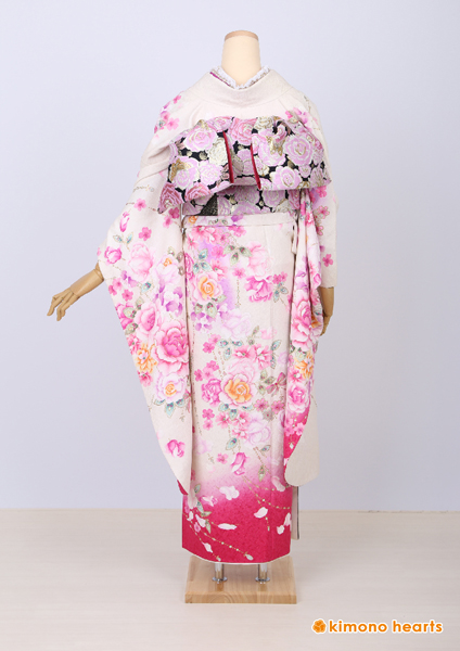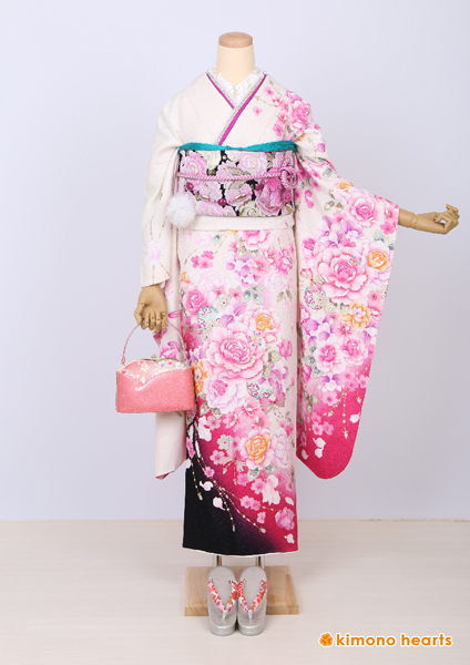 オフホワイトに可憐なローズ。裾はダークカラーのグラデーションがシック。甘さを抑えた大人振袖。