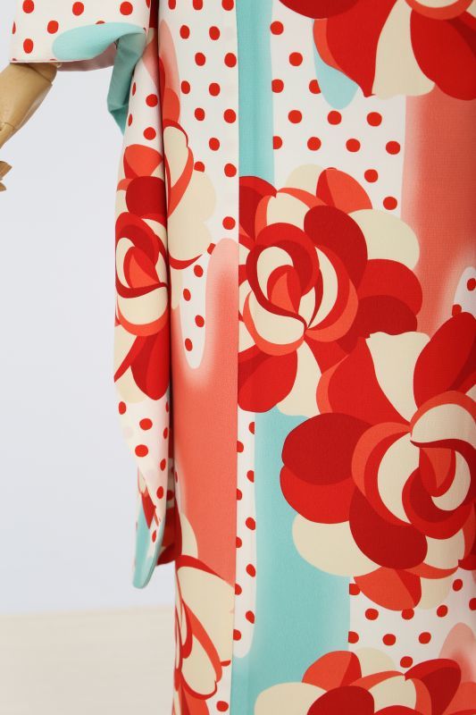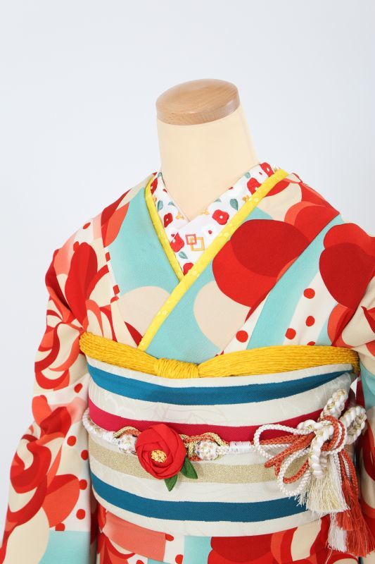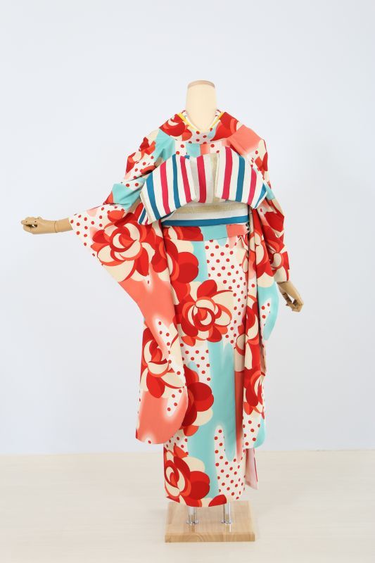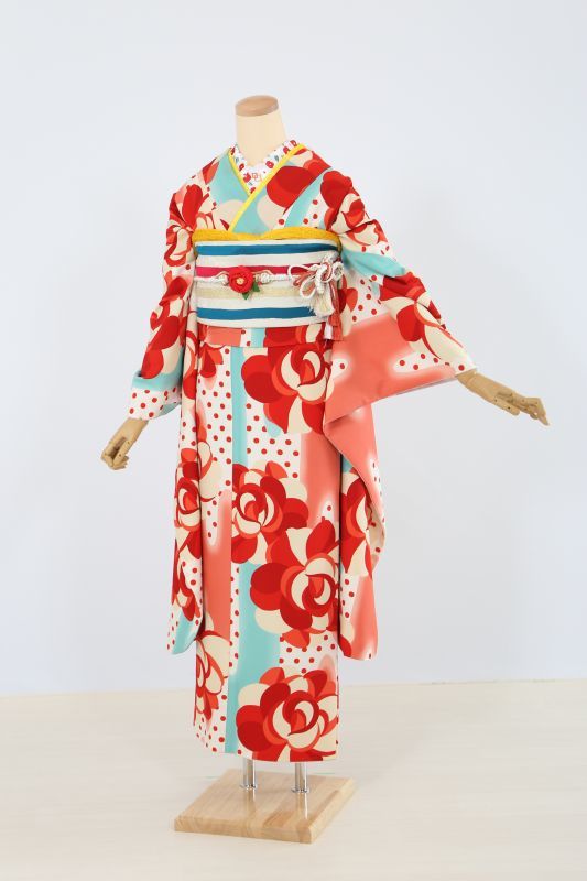 白地に赤いドット、その上に大きなお花が描かれたレトロモダンなお振袖。水色で可愛さを演出しながら、全てが明るい配色なのでとことん可愛くなります。ポップな雰囲気もあり今しか着れない一枚です。
