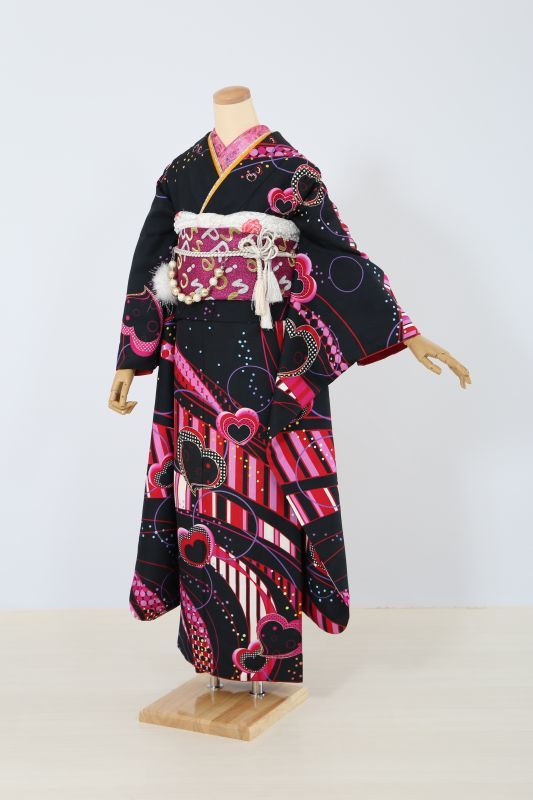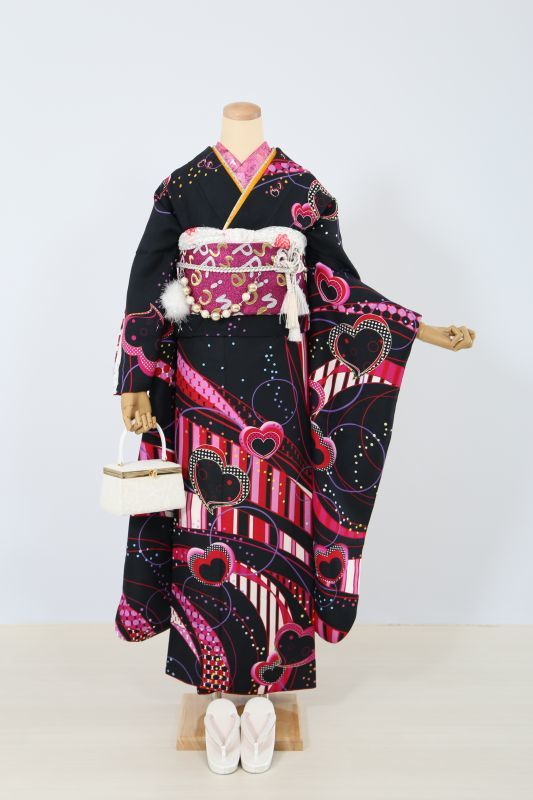 成人式振袖フルセット ハート 黒 ピンク プリンセス