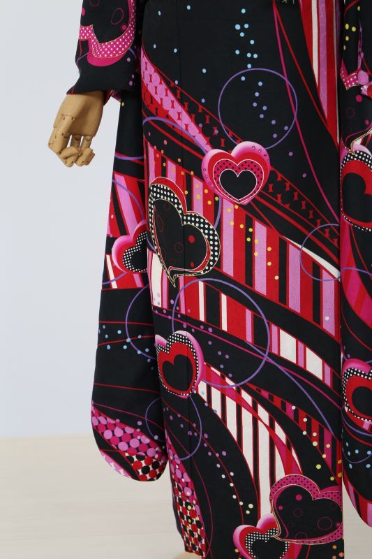 とことんラブリーに特化したお振袖。黒地にピンク・赤などでストライプやハート柄などとにかく派手で被らない一枚です。とにかく派手なので、人と違ったタイプにしたい方にオススメ。