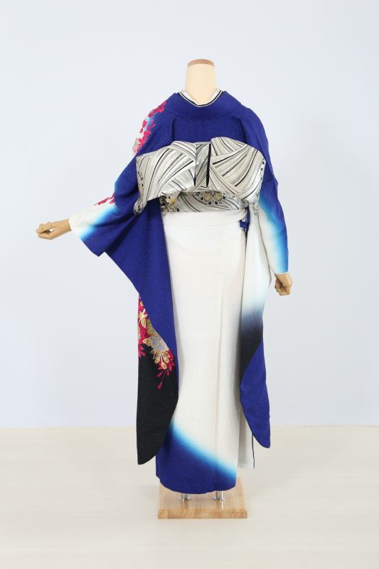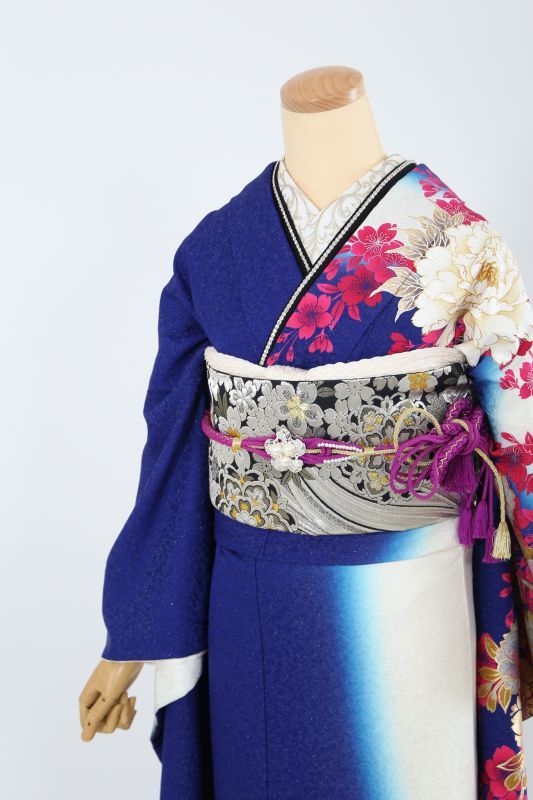 柄が左胸元のみの個性派な格好いいお振袖。深い海のようなブルーに大きな牡丹のお花がインパクト抜群です。後ろ姿は白が主張しており、前と後ろで雰囲気が変わるお洒落な一枚です。