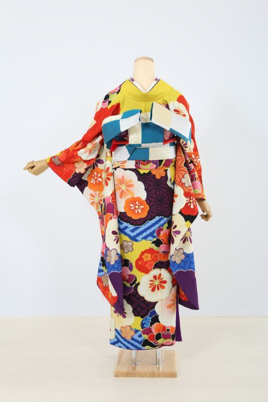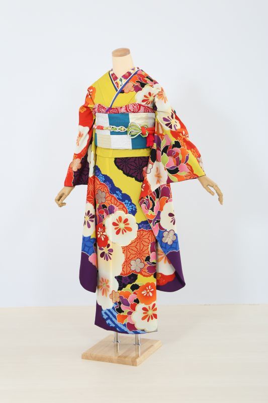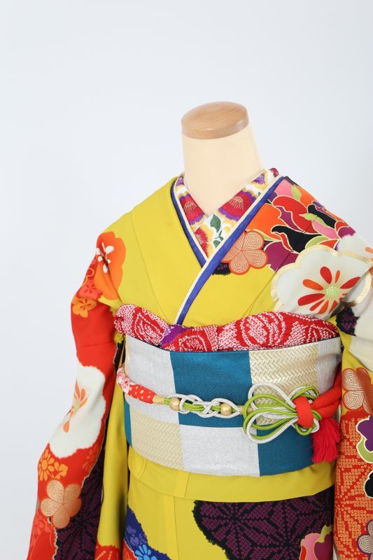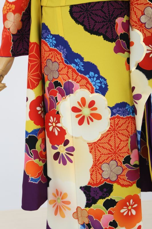 辛子色よりの深い黄色地にビビットな配色が華やかな大正ロマンなお振袖。柄は万寿菊など古典柄で色彩は濃く、鮮やかな一枚です。珍しい色合いなので人と違ったイメージにしたい方にオススメです。