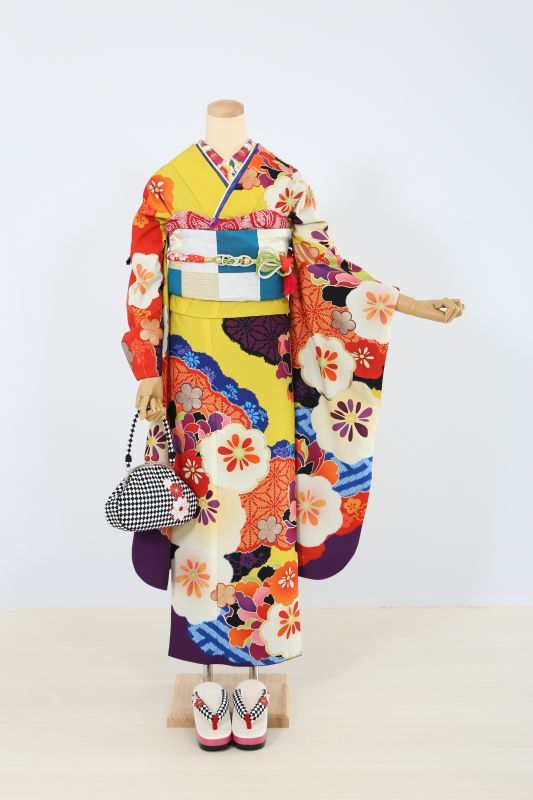 成人式振袖フルセット レトロ 黄色 大正ロマン 大柄