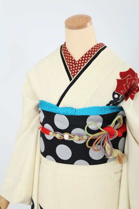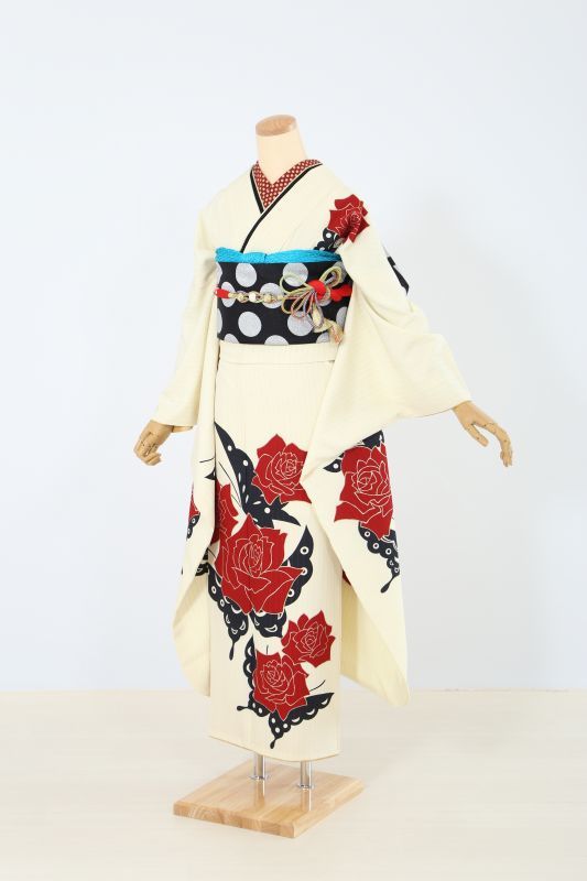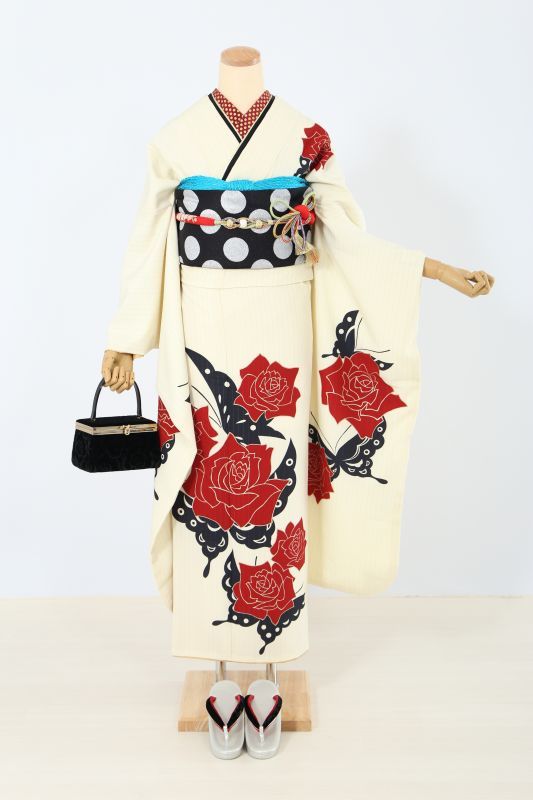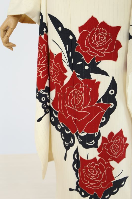 クリーム地に大きなバラと蝶がレトロモダンなお振袖。生地はストライプに銀色が入っており華やかさがあります。