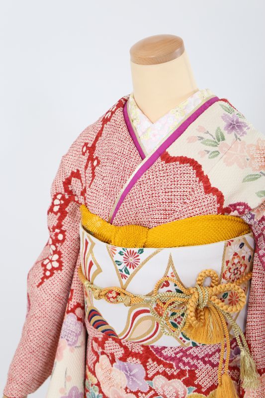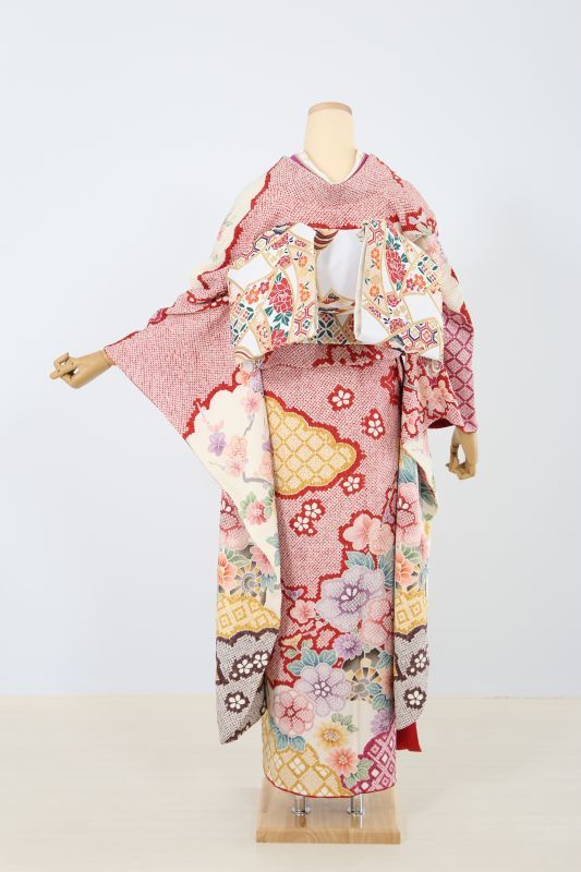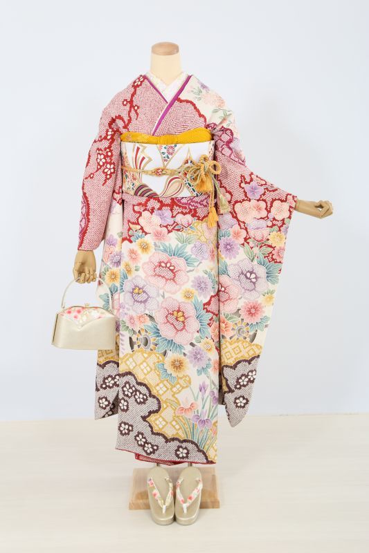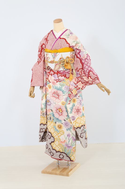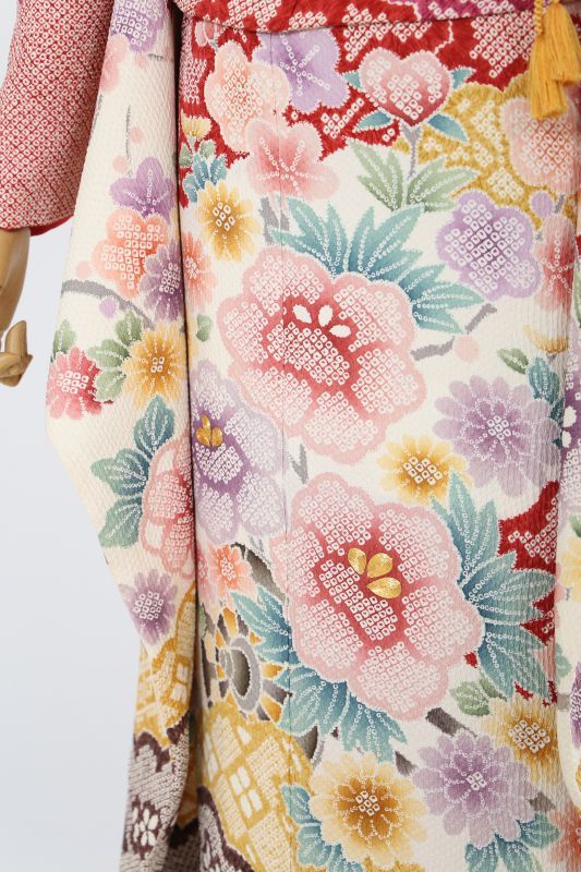 淡色でまとめられた、総絞りのお振袖。菖蒲・花車・雲取など伝統的な古典柄がふんだんに使われています。 上品と豪華が揃う逸品です。