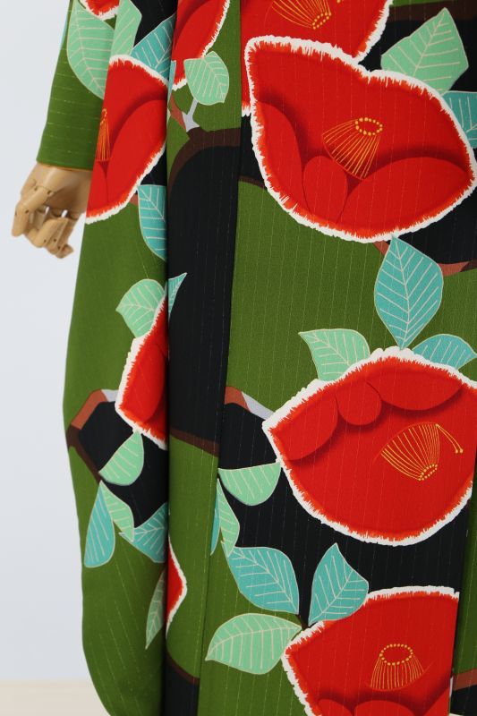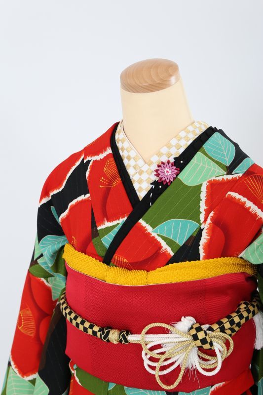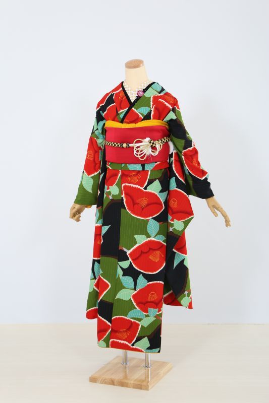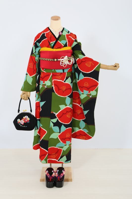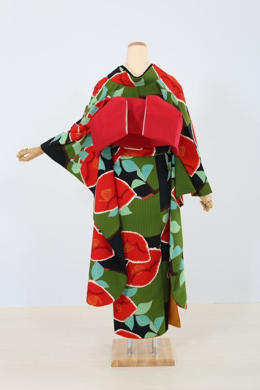 モスグリーンと黒色の地色に真っ赤な椿がレトロモダンなお振袖。地色が深い色なので派手すぎず、和風なイメージも残してくれます。 大正ロマンなイメージになる、お洒落な一枚です。