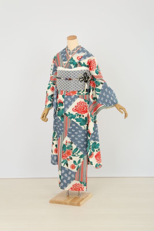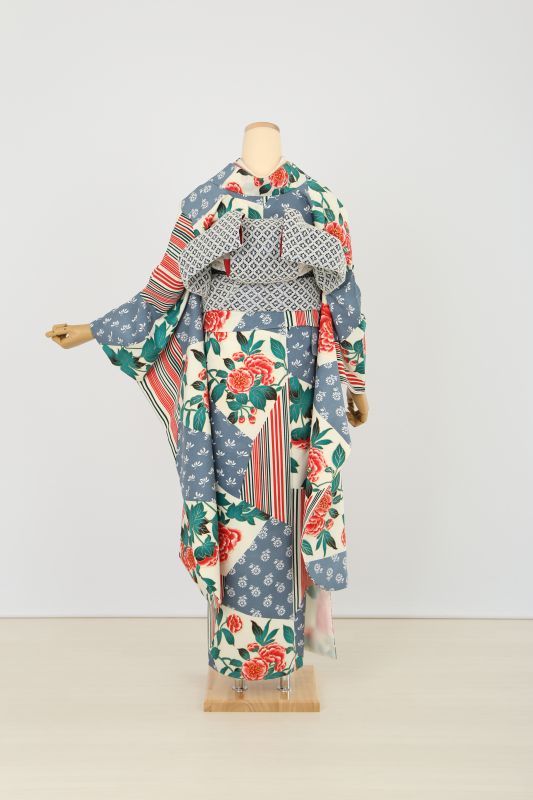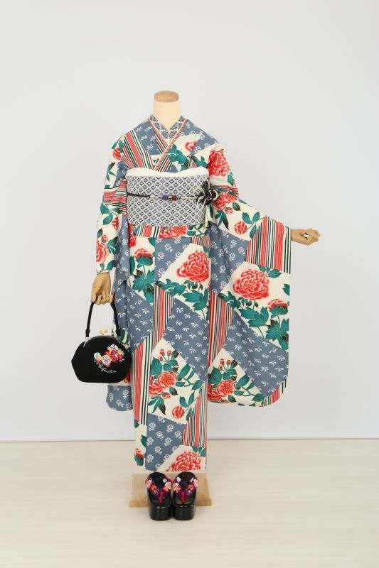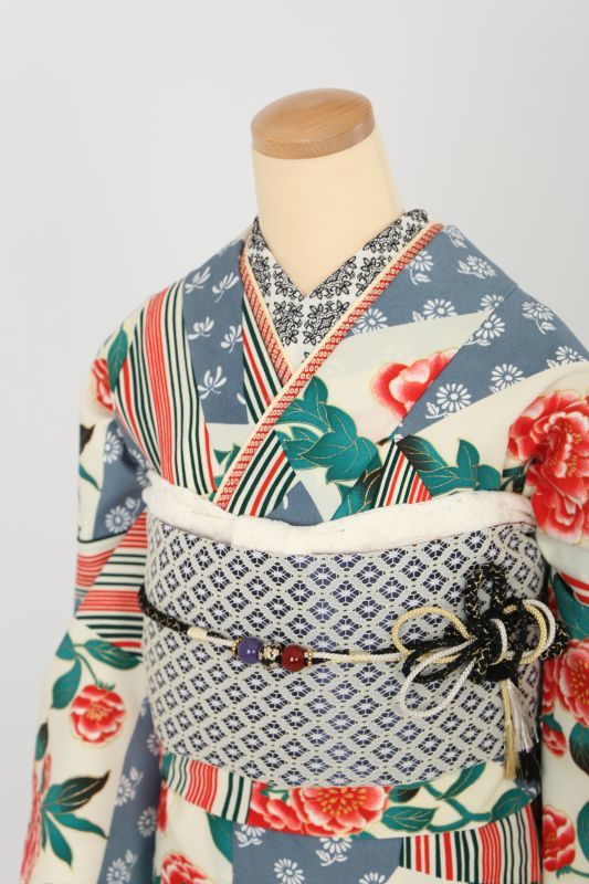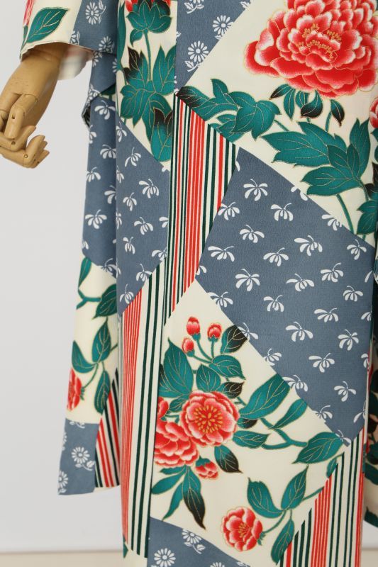 オフホワイトに牡丹やストライプ、小花柄が沢山ちりばめられたノスタルジックなお振袖。