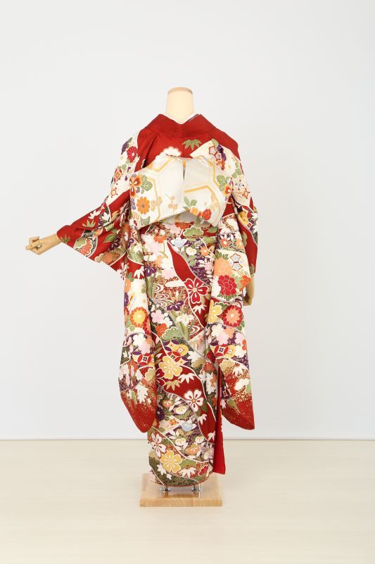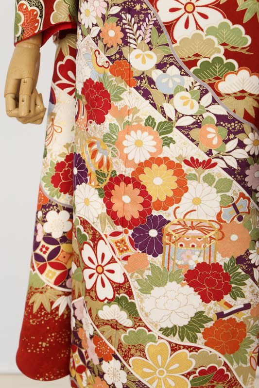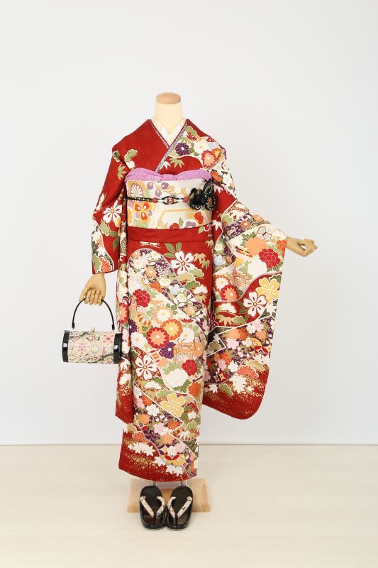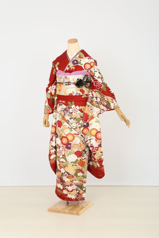 赤地に、たくさんの古典柄が入った豪華なお振袖。