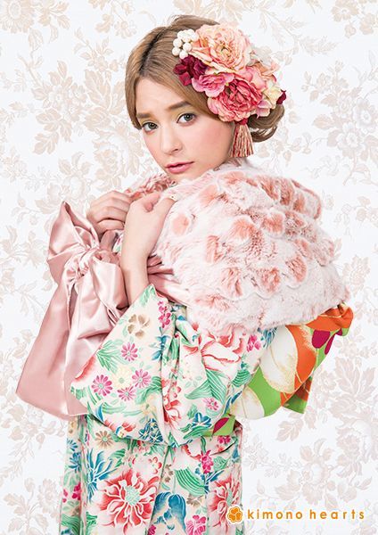 小花柄が可憐なアンティーク風振袖。スモーキーなピンクのショールでノスタルジックに仕上げて。
