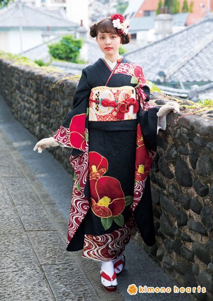 黒地のスッキリさに大胆な椿が印象的なお振袖。生地には金糸が織り込まれており、黒色なのにキラキラと華やかさを出してくれます。