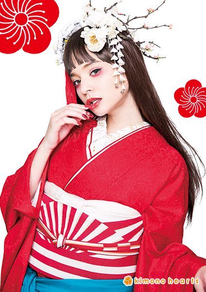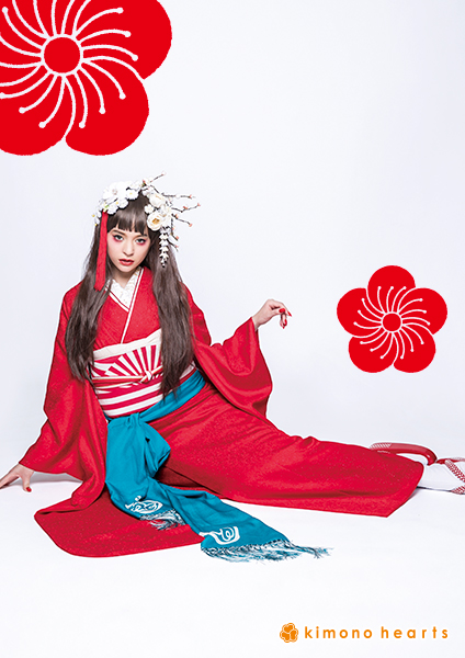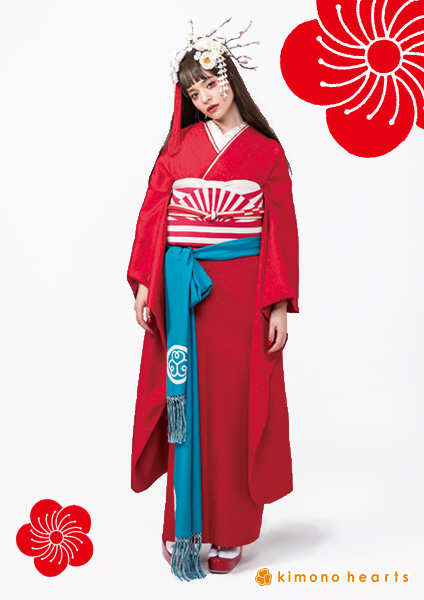 真っ赤な色無地に金糸が織り込まれて、キラキラしたキモノハーツオリジナル振袖。無地だからこそ出せる存在感があります。
