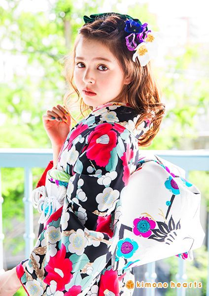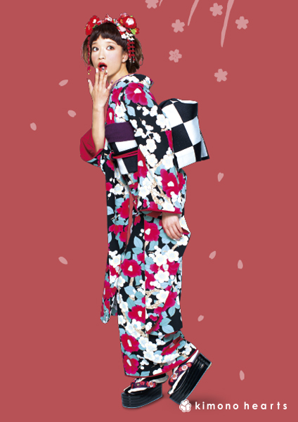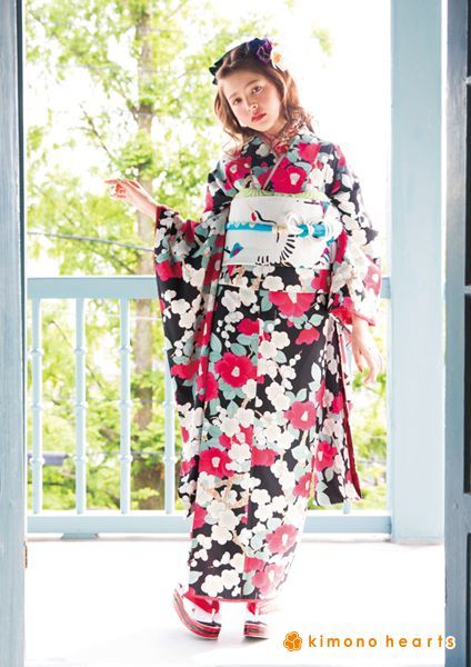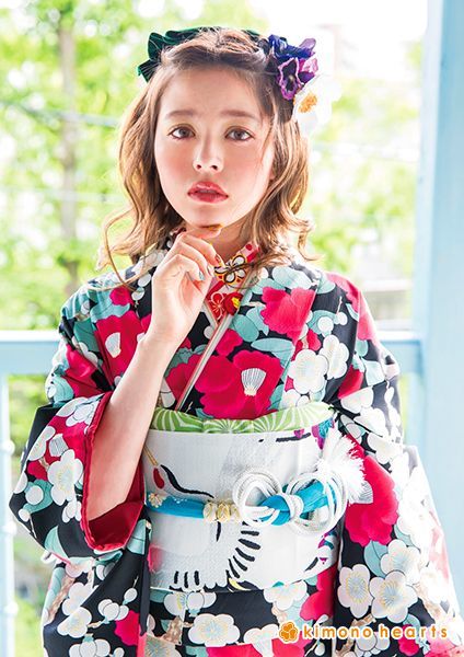 人気の椿柄振袖は、半衿のピンクでやわらかな印象に。刺繍ではなく染の半衿を使うのがキモノハーツ流。