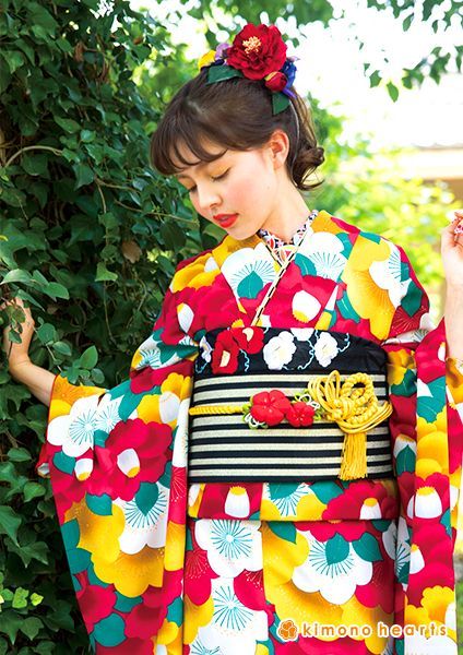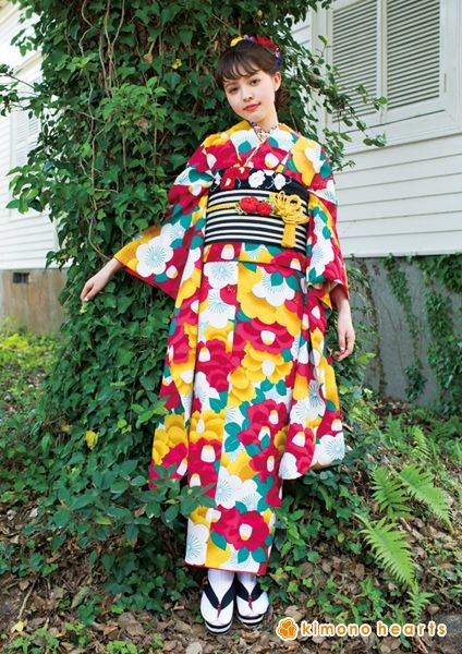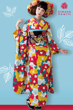 岡重さんの、椿づくしの大正ロマンなお振袖。黄色と赤の椿に白の梅と緑の葉っぱが派手すぎず可愛さを足してます。ノスタルジックにもレトロモダンにもできるお洒落なお振袖です。