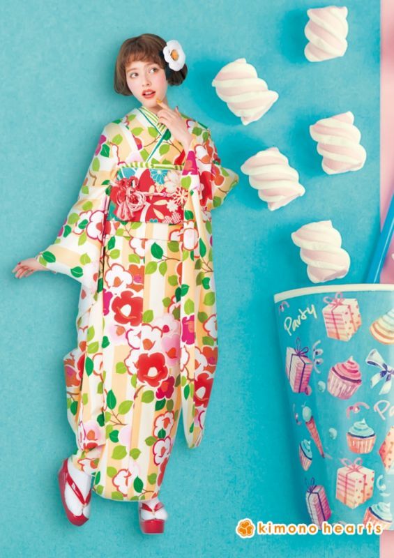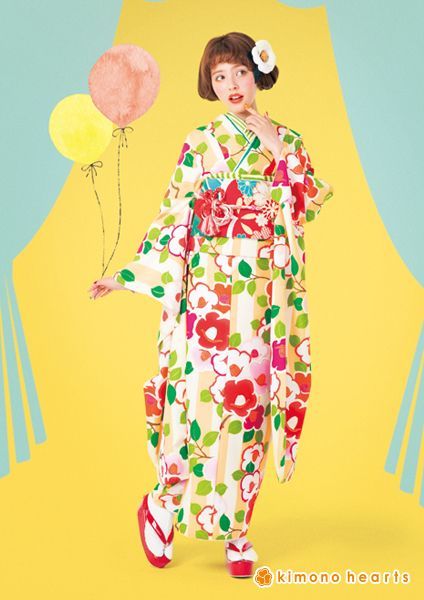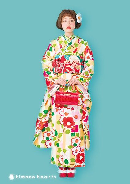 色とりどりの花々が華やか。赤い小物を合わせてレトロでスウィートな気分に。