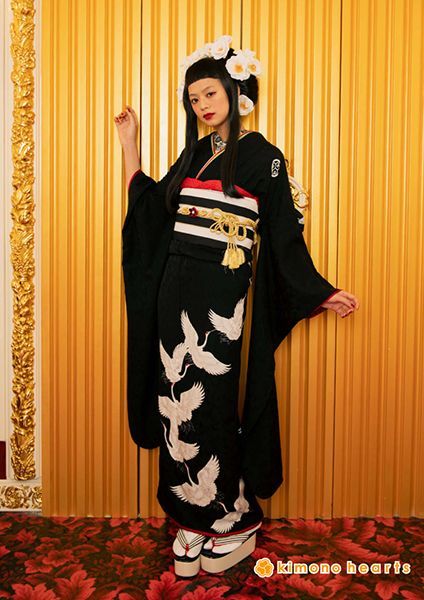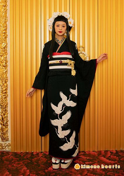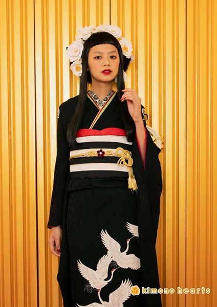 真っ黒な地色に家紋と流れるような鶴柄を入れて、留袖風に作ったキモノハーツオリジナル振袖です。花嫁さんみたいに袖口と裾口に綿を入れて真っ赤な”ふき”を作り、赤いディテールがお振袖をお洒落に演出してくれます。人と被りたくない方にオススメです。