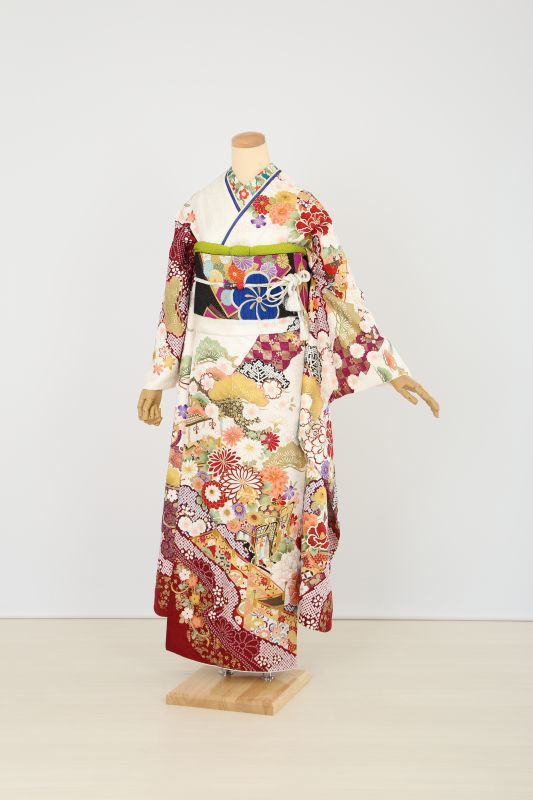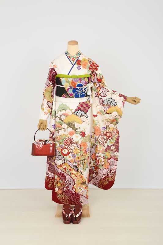 白地に 流水や松、菊などの伝統古典柄が沢山入った豪華なお振袖。裾に向かってエンジ色が多く入ってきて、上品な女性らしさを醸し出します。