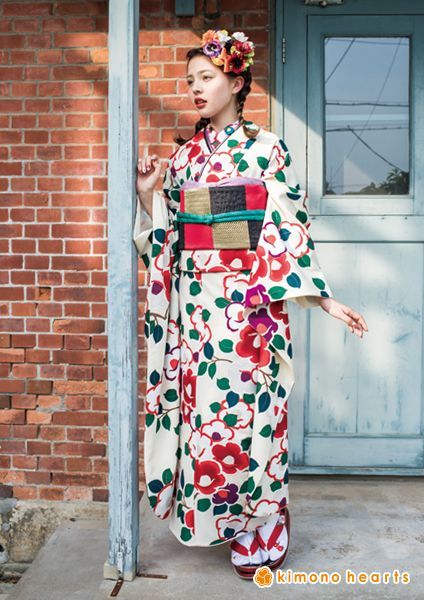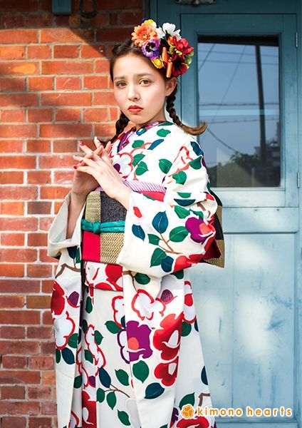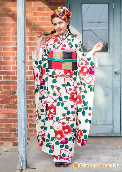 キモノハーツオリジナル椿柄振袖は、清楚で愛らしい印象に仕上げて。市松の帯で甘さを抑えることで一味違うコーデに。