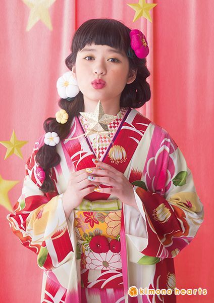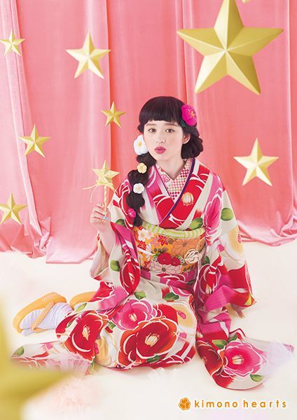 ピンクストレイプにコロンとした椿がキュート。帯周りはビタミンカラーを取り入れてとびきりカラフルに!