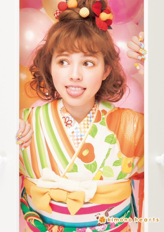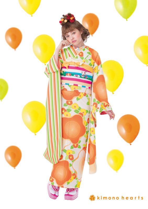 大きな梅に小さな椿。そしてストライプがキュートなキモノハーツオリジナル振袖。