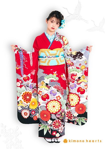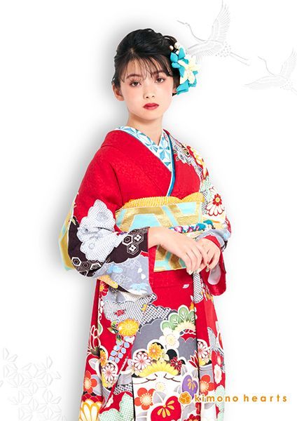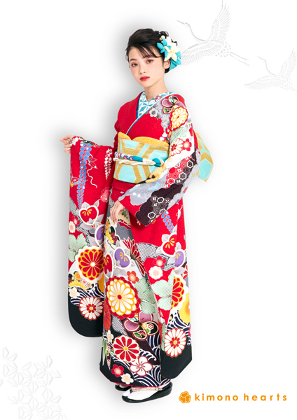 発色の良い、鮮やかな赤が魅力のお振袖。沖縄の紅型風で鮮やかな色使いが特徴的です。裾に黒茶が入っているので大人っぽさも演出してくれます。