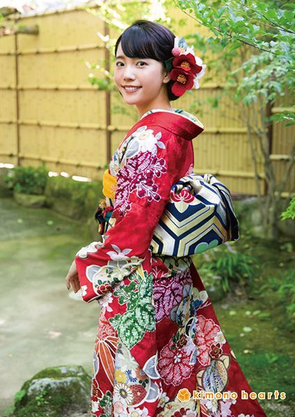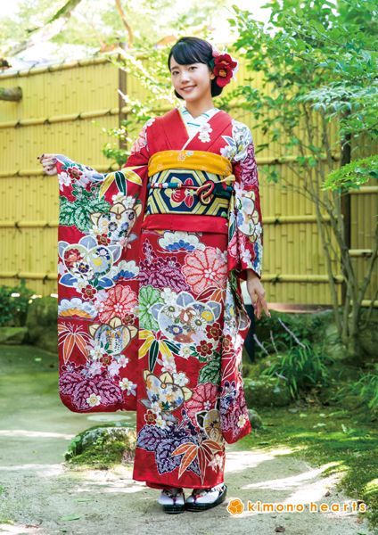 赤の地色に沢山の柄が入った華やかなお振袖。大きな柄で豪華さが際立ちます。