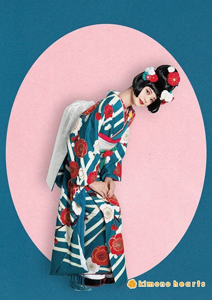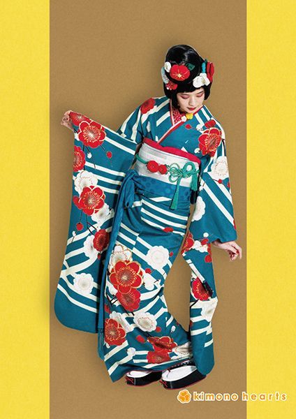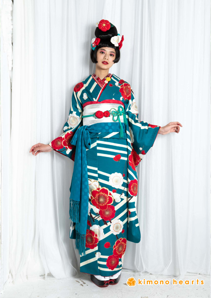 鮮やかなターコイズブルーが目を引くお振袖。個性的な幾何学な模様に、赤と白の梅柄が華やかさを出してくれます。
