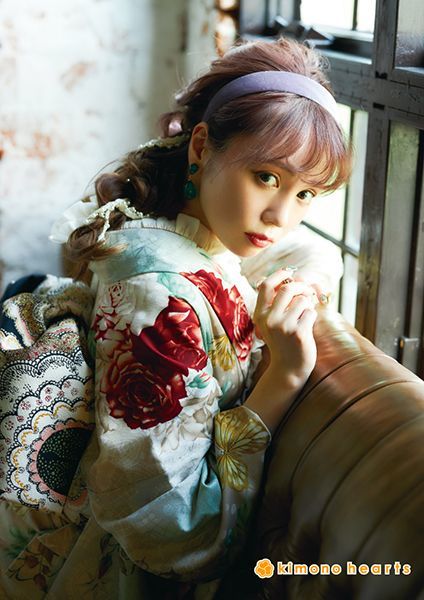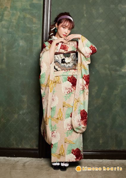 ベージュピンクの色にアンティークな薔薇がお洒落な、モダンアンテナさんのお振袖。蝶々がよりガーリーさ演出してくれます。 洋風な雰囲気で、レースの手袋などしてもオススメです。