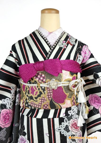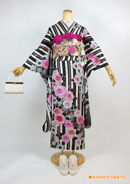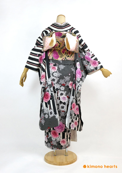 モダンな縞にピンクのアクセント。ピンクローズで彩られた和洋ミックスのクラシカル振袖。