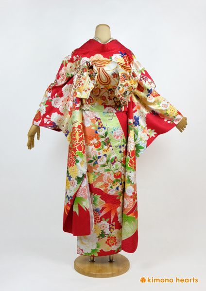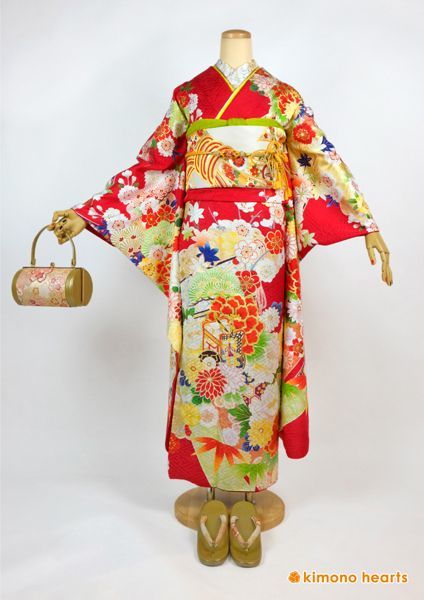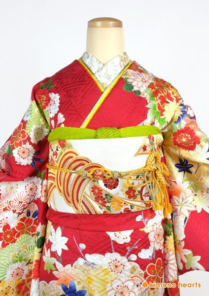 可憐な牡丹を中心に花々が咲き誇る優雅な古典柄振袖。正統派の赤に吉祥文様。晴れの日にふさわしい1着。