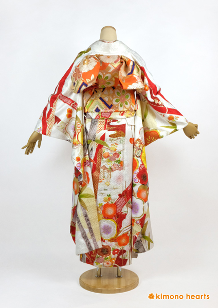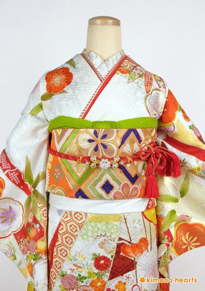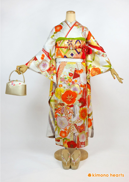 清楚な白の振袖はお顔写りが明るく華やか。丸い梅の花が可愛らしい。 ふんだんに金彩加工が施された豪華な1着。