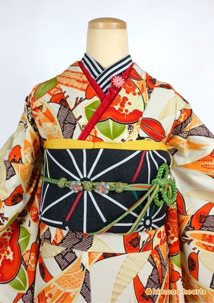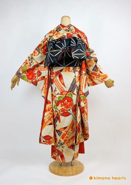 くすみ色のベージュがお洒落。笹と橘をあしらって大正レトロな雰囲気。 麻の葉の帯でレトロ感アップ。