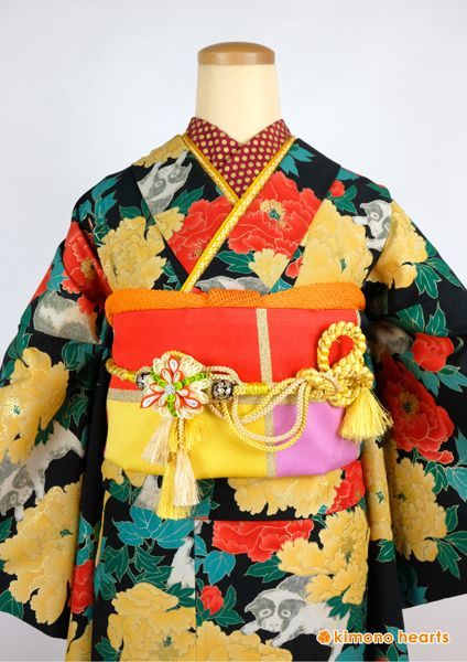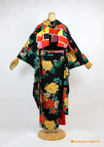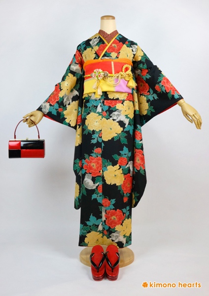 シックな色合いが昭和モダンな振袖。こっくりとした山吹色と朱色の牡丹がなんともレトロ。
