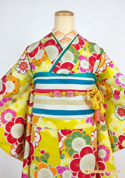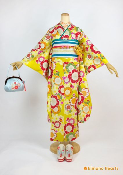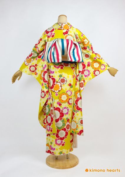 ポップでグラフィカル、そしてイエローが大胆なお振袖。トリコロールの帯でビタミンカラーいっぱいのコーディネートに。