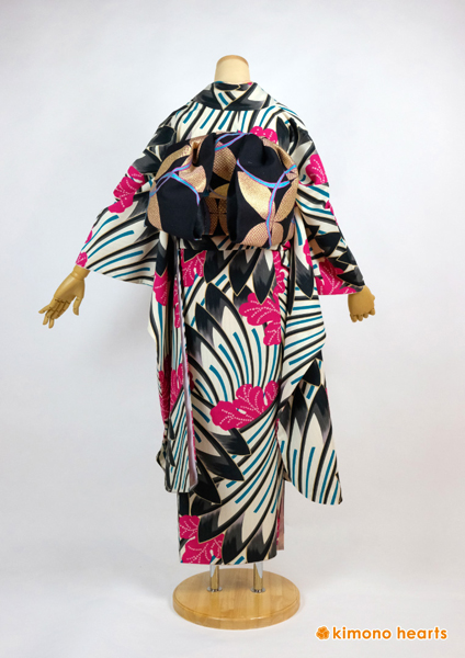大胆な柄が印象的な大正ロマンな振袖。ターコイズブルーを差し色にレトロモダンコーデ。