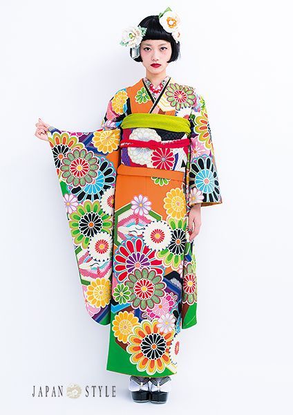 成人式用 振袖フルセット【橙・黄緑地に大菊レトロ振袖】【M-Lサイズ】
