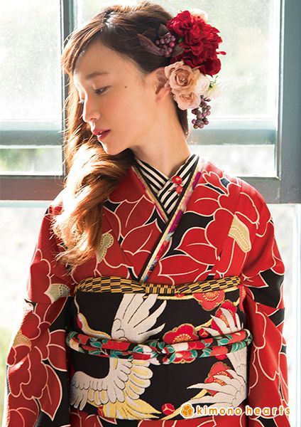 大胆な椿の柄が印象的。アンティーク調の鶴の帯で華やかに。