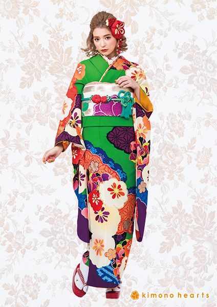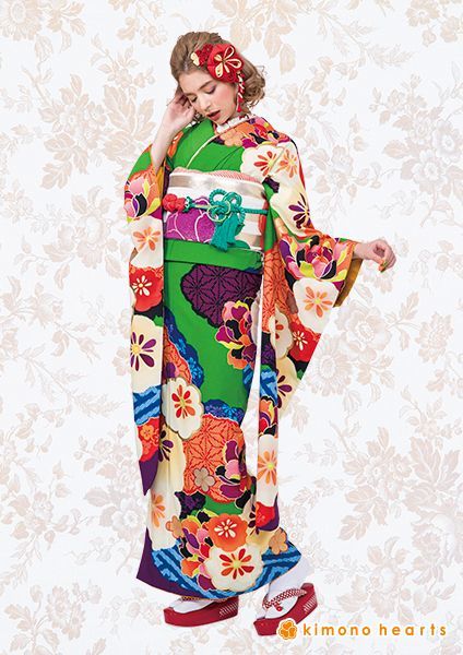 緑に深い紫が鮮やかな振袖。赤色の小物をを合わせてハイカラに。